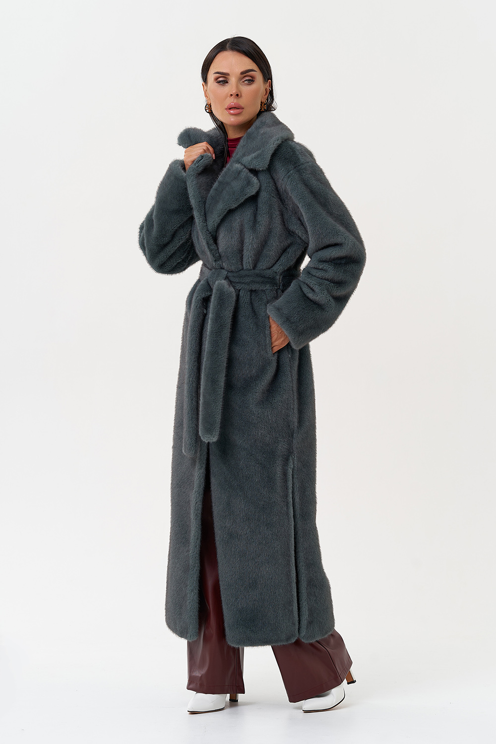 Фасон - прямой Длина изделия - 130 см Цвет - зеленый (ментол) Материал - экомех Состав полотна - полиэстер 100% Подкладка - полиэстер 100% Вид застежки -крючки, пояс Вид ворота - английский воротник Фасон рукава - втачной, длинный |